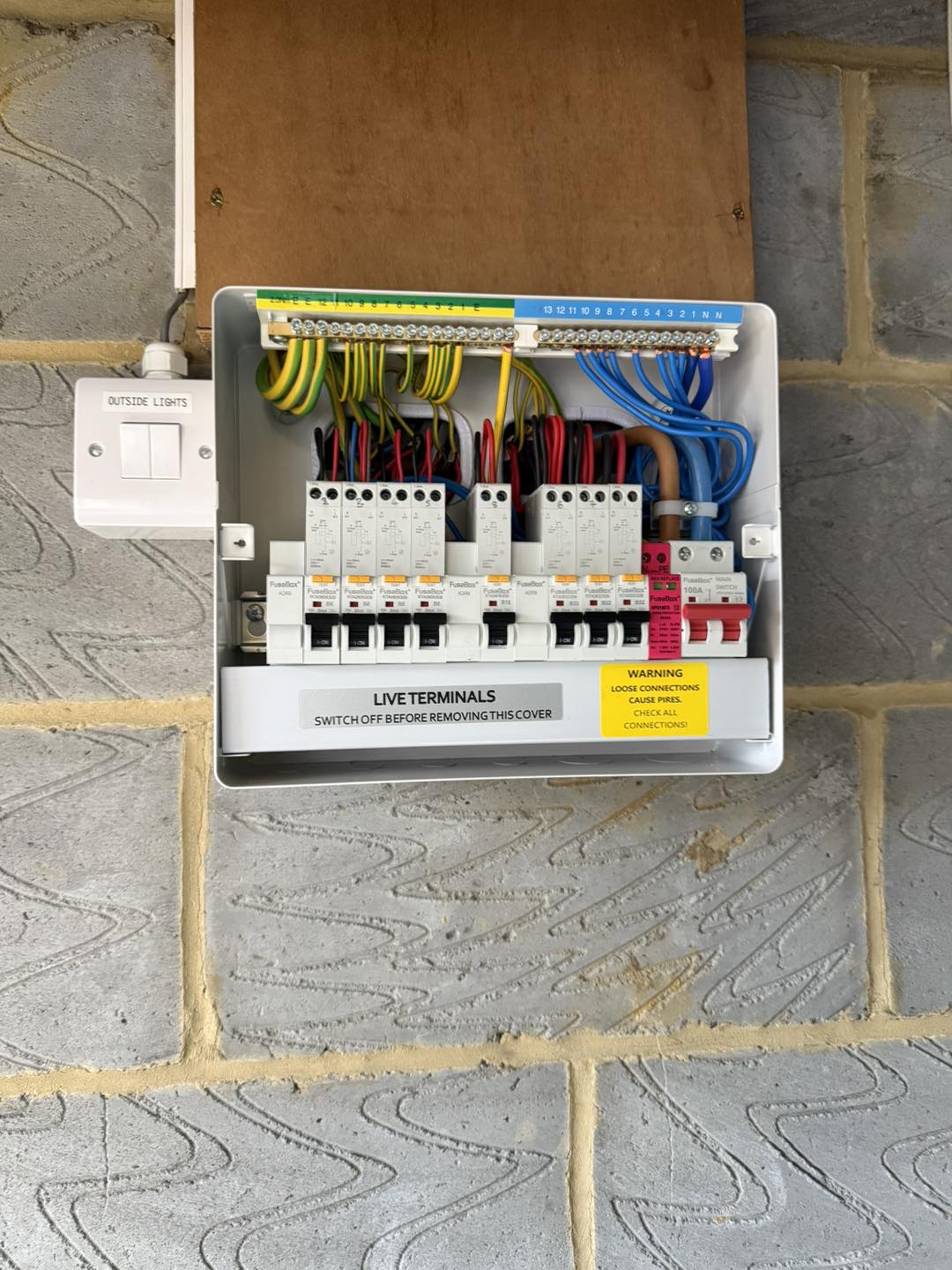Old fuse board replaced with a modern unit using RCBO + SPD protection for improved safety and reliability.